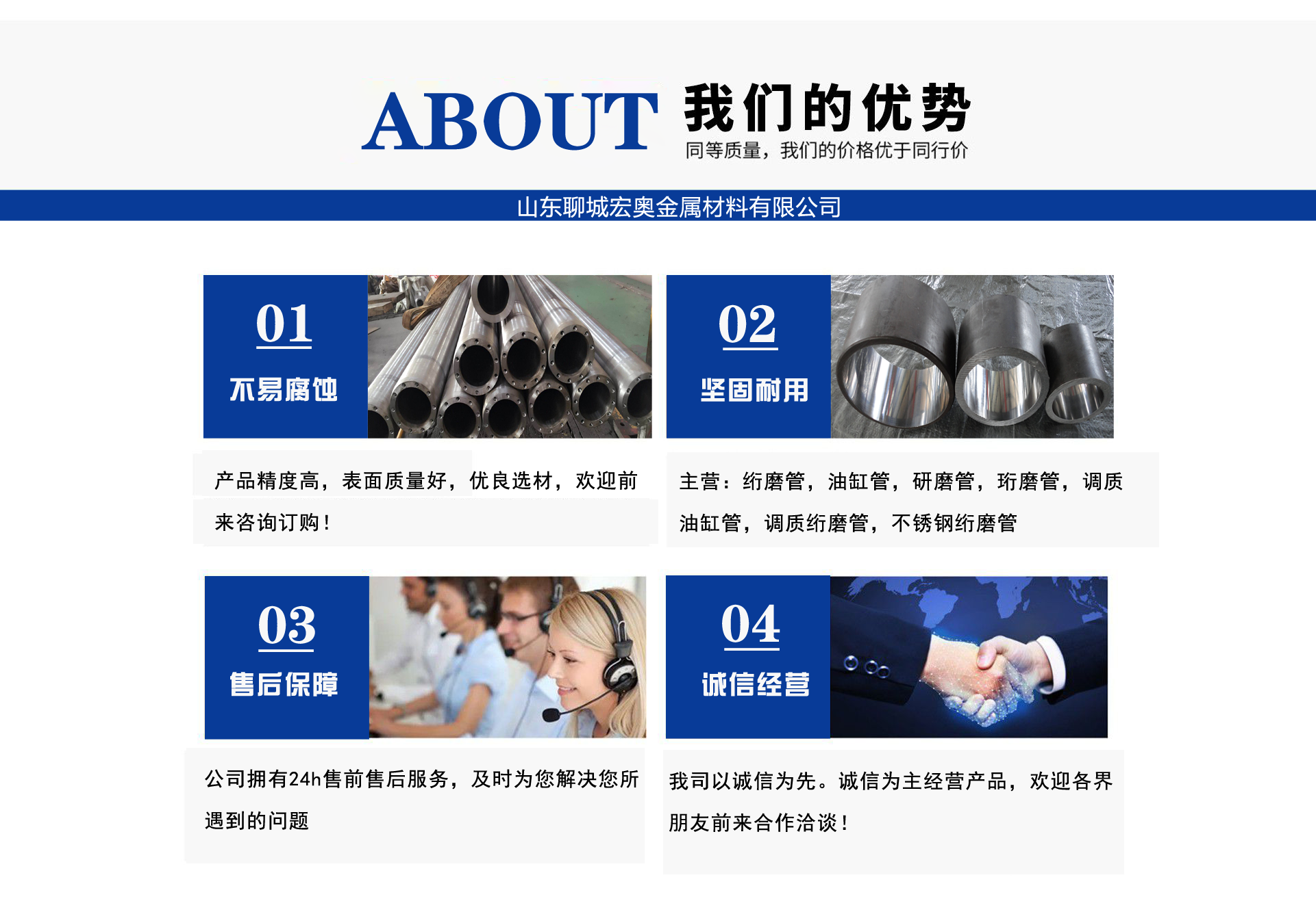 山東聊城宏奧金屬材料有限公司位于風景秀麗的江北水城-聊城。地理位置優(yōu)越,交通便利。主營絎磨管,油缸管,研磨管,珩磨管,調(diào)質(zhì)油缸管,調(diào)質(zhì)絎磨管,不銹鋼絎磨管等產(chǎn)品 廣泛應用于礦山、起重、船舶、煤炭、運輸、化工、科研、軍工等工業(yè)領域。 公司憑借雄厚的實力,豐富齊全的規(guī)格品種,完善的質(zhì)量保證,合理的價格,優(yōu)質(zhì)的服務,不斷地受到新老用戶及業(yè)內(nèi)人士的肯定和信任,我們本著及用戶之所及,想用戶之所想的服務宗旨不斷地拼搏,進取,在此對多年來支持我們的各行各業(yè)的新老朋友表示由衷的感謝,愿我們今后的合作更加愉快! 歡迎國內(nèi)外新老客戶來公司視察、蒞臨指導工作!...